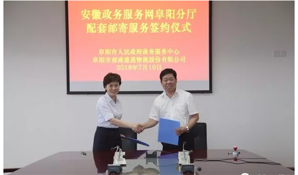近日,市政务服务中心和市邮政速递物流公司举行安徽省政务服务网阜阳分厅配套邮寄服务项目签约仪式。今后,市民到市政务服务中心办理事项,办理的各类证照、审批结果等可以免费邮寄到家。